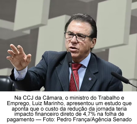 Na audiência, o ministro apresentou um estudo elaborado pela Pasta que chefia e aponta que o custo da redução da jornada teria impacto financeiro direto de 4,7% na folha de pagamento. Segundo o Ministério do Trabalho, o impacto “é perfeitamente absorvível, gerando ganhos de produtividade e redução de custos ocultos”.