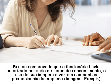 O colegiado reconheceu que a trabalhadora havia autorizado expressamente, por meio de termo de consentimento assinado, o uso gratuito de sua imagem e voz em campanhas promocionais da empresa, inclusive em redes sociais.